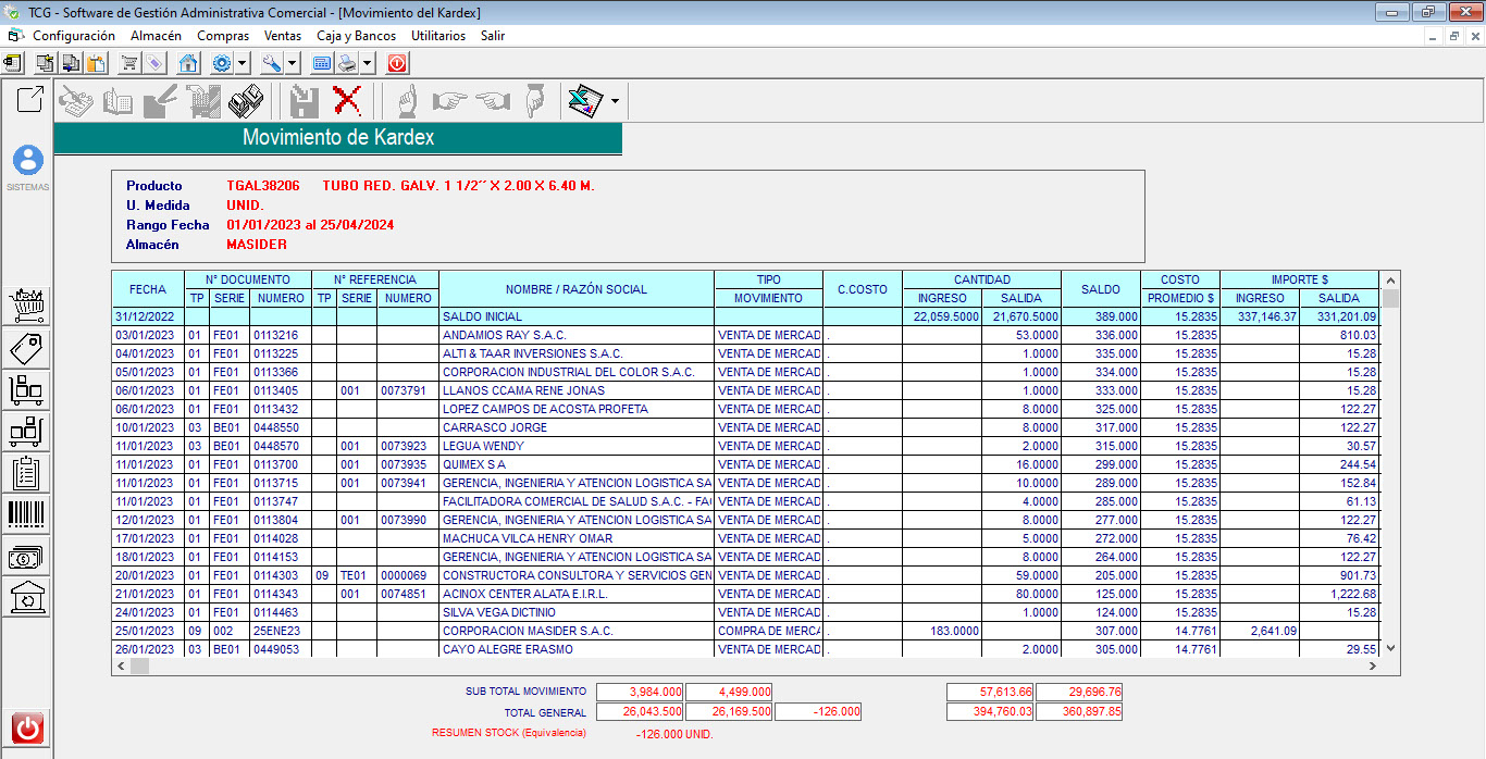 Sistema que permite mantener un control de la mercadería que la institución maneja, dicho control se basa en los movimientos de ingreso y salida de cada producto en el almacén, ya sean estas por las compras, ventas, transferencias, donaciones, devoluciones, etc., actualizando automáticamente las existencias de cada producto y el kárdex.